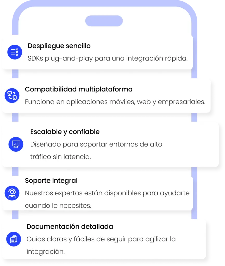 ZK Face Proof se integra a la perfección con sus sistemas actuales gracias a nuestra API fácil de usar para desarrolladores. Ya sea que utilice una aplicación bancaria, una plataforma de comercio electrónico o un portal de autenticación de telecomunicaciones, la integración es rápida, flexible y sencilla.
